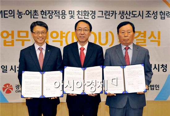 양영명 한국가스공사 연구개발원장, 우범기 광주시 경제부시장, 김춘추광주영농조합법인 이사(왼족부터)가 기념촬영을 하고있다.<br />