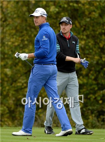 헨리크 스텐손(왼쪽)이 볼보월드매치플레이 8강전 경기 도중 4번홀에서 티 샷을 한 뒤 공을 바라보고 있다. 켄트(잉글랜드)=사진=Getty images/멀티비츠