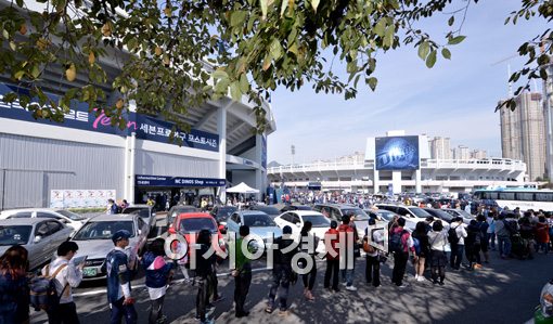 [창원=아시아경제 김현민 기자] LG 트윈스와 NC 다이노스의 프로야구 준플레이오프 1차전이 19일 경남 창원시 마산야구장에서 열린다. 현장 판매분의 티켓을 구입하기 위해 야구팬들이 줄을 서 있다. 김현민 기자 kimhyun81@asiae.co.kr<ⓒ세계를 보는 창 경제를 보는 눈, 아시아경제(www.asiae.co.kr) 무단전재 배포금지>