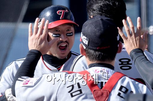 [창원=아시아경제 김현민 기자] LG 트윈스와 NC 다이노스의 프로야구 준플레이오프 1차전이 19일 경남 창원시 마산야구장에서 열렸다. 1회초 1사 2루에서 LG 이진영의 추가 1타점 2루타 때 득점을 올린 이병규(7)가 동료들의 환영을 받고 있다. 김현민 기자 kimhyun81@asiae.co.kr<ⓒ세계를 보는 창 경제를 보는 눈, 아시아경제(www.asiae.co.kr) 무단전재 배포금지>