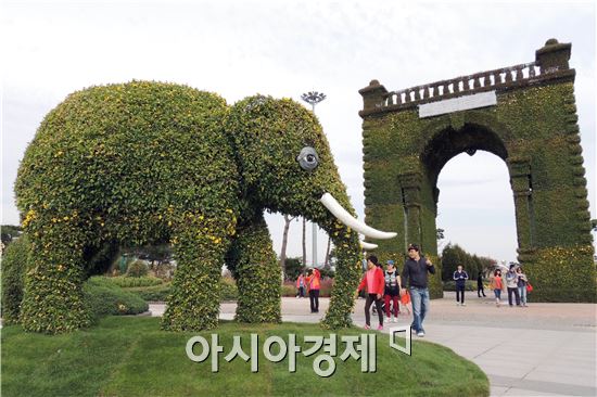 휴일인 19일 관광객들이 함평국향대전이 열릴 함평엑스포공원을 찾아와 대형 코끼리와 독립문 국화꽃을 보면서 가을을 만끽하고 있다.<br />