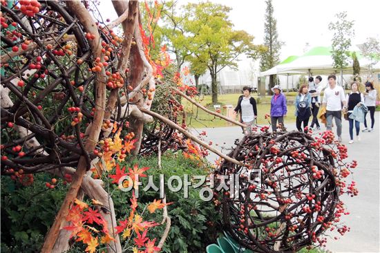 휴일인 19일 관광객들이 함평국향대전이 열릴 함평엑스포공원을 찾아와 맹감과 단풍을 이용해 만들어놓은 탑을 보면서 가을을 만끽하고 있다.<br /> <br /> 함평군은 ‘국화향기 그윽한 풍요로운 함평천지!’라는 주제로 10월24일부터 11월9일까지 17일간 함평군 함평읍 함평엑스포공원에서 개최한다.