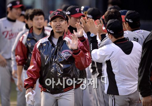 [창원=아시아경제 김현민 기자] LG 트윈스와 NC 다이노스의 프로야구 준플레이오프 1차전이 19일 경남 창원시 마산야구장에서 열렸다. 13-4로 대승을 거둔 LG 선수들이 자축하고 있다. 김현민 기자 kimhyun81@asiae.co.kr<ⓒ세계를 보는 창 경제를 보는 눈, 아시아경제(www.asiae.co.kr) 무단전재 배포금지>
