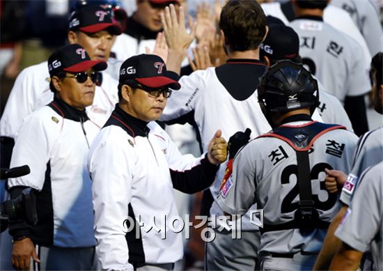 NC와의 준플레이오프 1차전을 승리로 이끈 양상문 LG 감독(가운데)[사진=김현민 기자]
