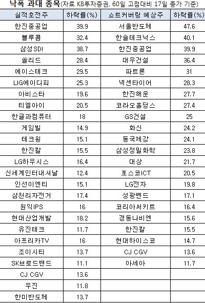 [아시아경제 박미주 기자]코스피 낙폭이 완만해지면서 이맘 때 수익을 낼 수 있는 종목을 발굴하기 위한 투자자들의 발걸음이 분주해지고 있다. 기업 밸류에이션과 비교해 과도하게 떨어졌거나 향후 실적 개선 가능성이 충분한데 장세에 휩쓸려 내려앉은 종목이 포트폴리오 1순위로 거론되고 있다. 여기에 전문가들은 공매도한 주식을 되갚기 위해 사들이는 '쇼트 커버링'이 나타날 가능성이 있는 주식을 매집하는 전략을 펼 수 있다고 조언했다.22일 한국거래소에 따르면 전날 종가 기준 코스피지수는 이달 들어서만 4.92% 떨어졌다. 코스닥지수 또한 2.27% 하락했다.지난달만해도 2050선을 웃돌던 코스피지수가 급락하며 1900선 초반에 머물자 증권사들은 최근 낙폭과대주를 주목해야 한다는 보고서를 쏟아내고 있다. '낙폭과대주 단기 반등 노려볼만하다', '낙폭과대의 경험', '지금 낙폭과대주를 사야하는 이유', '반등이 기대되는 낙폭과대 종목 선정', '대형주 낙폭 과대 vs. 실적호전주 찾기' 등이다.'공포에 매수하라'는 증시 격언을 따를 시기라는 얘기다. 코스피지수가 현재 저평가 상태이고 반등이 기대되기 때문이다. 최동환 신한금융투자 연구원은 "최근 코스피지수는 2012년 5월, 작년 6월과 유사한 급락세가 진행 중인데 추세ㆍ모멘텀 지표의 절대 과매도 구간 진입이 확인된다"며 "달러화 강세가 제한되며 변동성의 하향 안정화가 예상된다"고 말했다.신중호 이트레이드증권 연구원은 "코스피지수는 주가순자산비율(PBR)이 현재 1.02배로 주요 저점구간 PBR이 2011년 9월 1.03배, 2012년 7월 1.03배, 2013년 7월 1.0배였던 것과 비교해 낮다"며 "현재 PBR은 올해 2분기 이후 자본 성장이 없다는 가정에서 계산된 것이라 PBR 밸류에이션이 더 할인됐을 것"이라고 분석했다. 이어 "2012년 구간이후로 보면 급락 이후 반등의 평균 상승률은 6.7%로 많이 빠진 업종의 상승탄력이 강했다"고 덧붙였다. 투자할만한 과대낙폭주로는 우선 실적이 호전될 것으로 전망되는 종목을 꼽을 수 있다. 실적이 좋아져야 반등할 가능성이 크기 때문이다.KB투자증권에 따르면 지난 17일 종가 기준 이에 속하는 종목이 블루콤, 삼성SDI, 쏠리드, 에이스테크, LIG에이디피, 한글과컴퓨터, 게임빌, 테크윙, 한진칼, LG하우시스 등이다. 신세계인터내셔날과 삼천리자전거, 원익IPS, 유진테크, 아프리카TV, 조이시티, SK브로드밴드, CJ CGV, 우진, 한미반도체 등도 실적호전 낙폭과대주다. 한진중공업, 아비스타, 티엘아이, 인선이엔티, 현대산업개발 등의 경우 3분기 영업이익이 흑자전환할 것으로 추정된다. 이들은 올해 3분기와 내년 매출액 증가율이 5% 이상이고, 영업이익 증가율이 20% 이상 또는 흑자전환 조건을 동시에 만족하는 기업 중에서 60일 최고가 대비 10%이상 하락한 종목들이다.최근 공매도 비중이 높은 종목의 쇼트커버링 가능성에 투자하는 것도 한 방법이다. 김솔 KB투자증권 연구원은 "지난 10일 코스피 공매도 비중이 5.33%로 지난해 11월8일 6.09% 이후 4번째로 큰 값을 기록했다"며 "공매도 비중은 단기 급등 후 완화되는 패턴을 보이고 있어 이번 경우 역시 공매도 비중이 하락할 것으로 예상돼 공매도 종목들의 쇼트커버링에 대한 기대감도 커졌다"고 짚었다.KB투자증권이 꼽은 쇼트커버링 예상 종목은 서울반도체와 한솔테크닉스, 한진중공업, 대우건설, 파트론, 넥센타이어, 한진해운, 코라오홀딩스, GS건설, 화신 등이다. 동국제강과 삼성정밀화학, 대상, 포스코 ICT, LG전자, 성광벤드, 코리아써키트, 경동나비엔, 한진칼, 현대하이스코, CJ CGV, 아세아 등도 이에 포함된다. 이 종목들은 누적 공매도와 유통시가총액 대비 대차잔고 비중 상위이면서 지난 20일 외국인이 순매수했다는 공통점을 지니고 있다.낙폭 과대 종목(KB투자증권, 지난 17일 종가 기준)