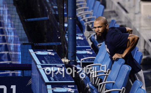 [창원=아시아경제 김현민 기자] 프로야구 NC 테임즈가 21일 마산야구장에서 LG 트윈스와의 준플레이오프 2차전을 앞두고 내리는 비를 바라보고 있다. 김현민 기자 kimhyun81@asiae.co.kr<ⓒ세계를 보는 창 경제를 보는 눈, 아시아경제(www.asiae.co.kr) 무단전재 배포금지>