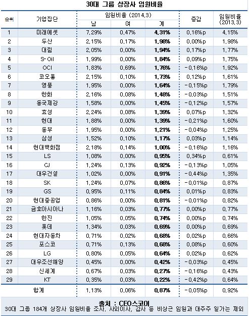 30대그룹 상장사 임원 비율(자료 CEO스코어)