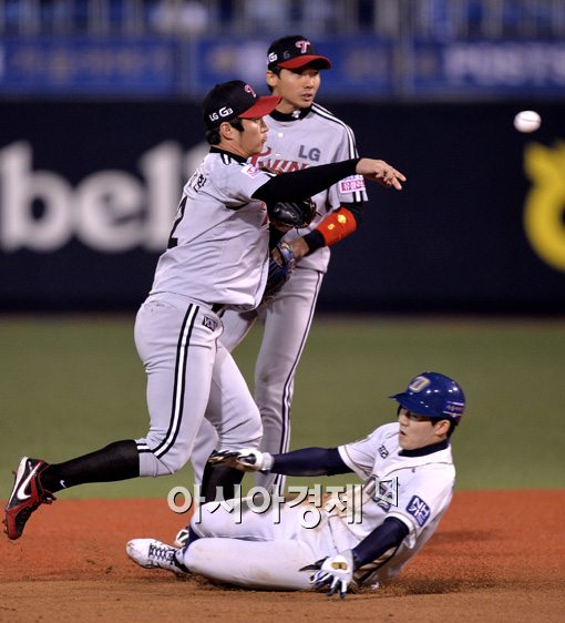 [창원=아시아경제 김현민 기자] 프로야구 LG 트윈스와 NC 다이노스의 준플레이오프 2차전이 22일 마산야구장에서 열렸다. 1회말 무사 1루에서 LG 유격수 오지환이 NC 김종호의 2루수 땅볼때 1루주자 박민우를 포스아웃시키고 1루로 송구해 병살처리하고 있다. 김현민 기자 kimhyun81@asiae.co.kr<ⓒ세계를 보는 창 경제를 보는 눈, 아시아경제(www.asiae.co.kr) 무단전재 배포금지>