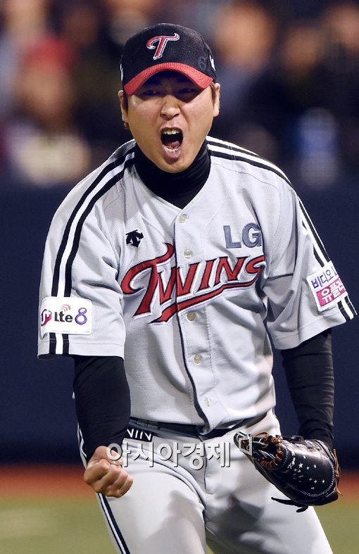 [창원=아시아경제 김현민 기자] 프로야구 LG 트윈스와 NC 다이노스의 준플레이오프 2차전이 22일 마산야구장에서 열렸다. LG 선발 우규민이 4회말 1사 1,3루의 위기에서 NC 테임즈를 2루수 라인드라이브 병살로 처리한 뒤 포효하고 있다. 김현민 기자 kimhyun81@asiae.co.kr<ⓒ세계를 보는 창 경제를 보는 눈, 아시아경제(www.asiae.co.kr) 무단전재 배포금지>