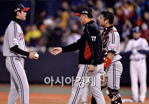 [창원=아시아경제 김현민 기자] 프로야구 LG 트윈스와 NC 다이노스의 준플레이오프 2차전이 22일 마산야구장에서 열렸다. LG 선발 우규민이 6회초 무사 1,2루의 위기에서 강판되고 있다. 김현민 기자 kimhyun81@asiae.co.kr<ⓒ세계를 보는 창 경제를 보는 눈, 아시아경제(www.asiae.co.kr) 무단전재 배포금지>