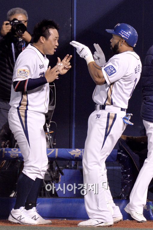 [창원=아시아경제 김현민 기자] 프로야구 LG 트윈스와 NC 다이노스의 준플레이오프 2차전이 22일 마산야구장에서 열렸다. 7회말 NC 선두타자 테임즈가 LG 신재웅을 상대로 솔로 홈런을 치고 김태군과 세리머니하고 있다. 김현민 기자 kimhyun81@asiae.co.kr<ⓒ세계를 보는 창 경제를 보는 눈, 아시아경제(www.asiae.co.kr) 무단전재 배포금지>