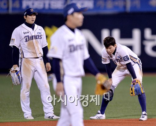 [창원=아시아경제 김현민 기자] 프로야구 LG 트윈스와 NC 다이노스의 준플레이오프 2차전이 22일 마산야구장에서 열렸다. 9회초 1사 1루에서 LG 이병규(7)의 2루수 뜬공을 놓치며 1실점 한 NC 박민우가 고개를 떨구고 있다. 김현민 기자 kimhyun81@asiae.co.kr<ⓒ세계를 보는 창 경제를 보는 눈, 아시아경제(www.asiae.co.kr) 무단전재 배포금지>