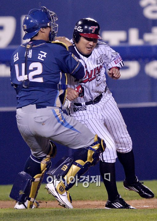 [아시아경제 김현민 기자] 프로야구 NC 다이노스와 LG 트윈스의 준플레이오프 3차전이 24일 잠실야구장에서 열렸다. 2회말 1사 2,3루에서 LG 최경철의 스퀴즈 번트때 3루주자 이진영이 협살에 걸려 NC 포수 김태군에 태그아웃되고 있다. 김현민 기자 kimhyun81@asiae.co.kr<ⓒ세계를 보는 창 경제를 보는 눈, 아시아경제(www.asiae.co.kr) 무단전재 배포금지>