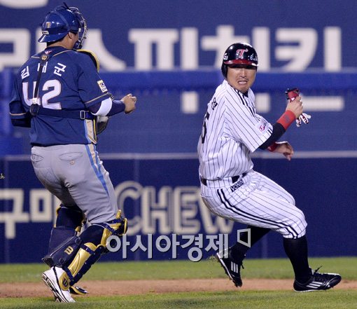[아시아경제 김현민 기자] 프로야구 NC 다이노스와 LG 트윈스의 준플레이오프 3차전이 24일 잠실야구장에서 열렸다. 2회말 1사 2,3루에서 LG 최경철의 스퀴즈 번트때 3루주자 이진영이 협살에 걸려 NC 포수 김태군에 태그아웃되고 있다. 김현민 기자 kimhyun81@asiae.co.kr<ⓒ세계를 보는 창 경제를 보는 눈, 아시아경제(www.asiae.co.kr) 무단전재 배포금지>