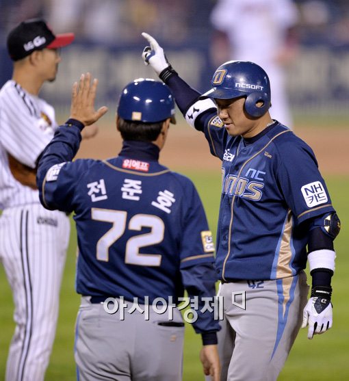[아시아경제 김현민 기자] 프로야구 NC 다이노스와 LG 트윈스의 준플레이오프 3차전이 24일 잠실야구장에서 열렸다. 8회초 2사 3루에서 NC 김태군이 추가 1타점 적시타를 치고 환호하고 있다. 김현민 기자 kimhyun81@asiae.co.kr<ⓒ세계를 보는 창 경제를 보는 눈, 아시아경제(www.asiae.co.kr) 무단전재 배포금지>