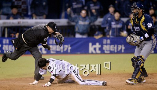 [아시아경제 김현민 기자] 프로야구 NC 다이노스와 LG 트윈스의 준플레이오프 3차전이 24일 잠실야구장에서 열렸다. 8회말 1사 3루에서 LG 이병규(9)의 내야땅볼때 홈으로 쇄도한 3루주자 황목치승이 NC 김태군 포수에 태그아웃되고 있다. 김현민 기자 kimhyun81@asiae.co.kr<ⓒ세계를 보는 창 경제를 보는 눈, 아시아경제(www.asiae.co.kr) 무단전재 배포금지>