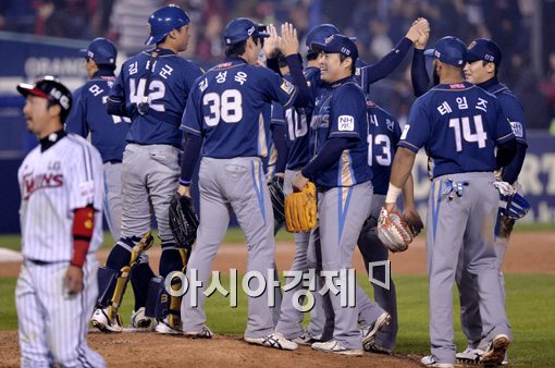 [아시아경제 김현민 기자] 프로야구 NC 다이노스와 LG 트윈스의 준플레이오프 3차전이 24일 잠실야구장에서 열렸다. NC 선수들이 4-3 승리를 확정짓고 기쁨을 나누고 있다. 김현민 기자 kimhyun81@asiae.co.kr<ⓒ세계를 보는 창 경제를 보는 눈, 아시아경제(www.asiae.co.kr) 무단전재 배포금지>