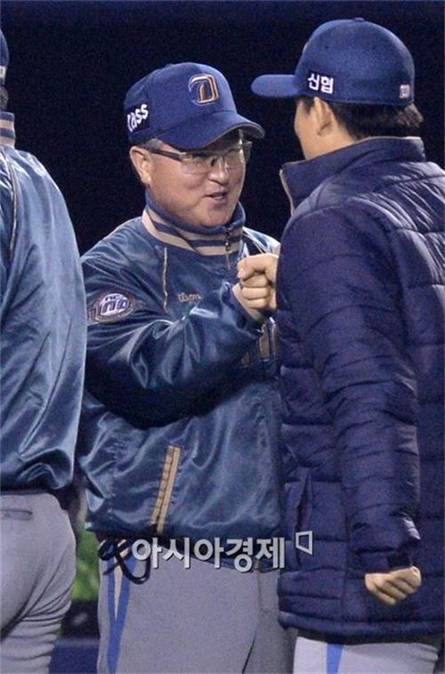 [아시아경제 김현민 기자] 프로야구 NC 다이노스와 LG 트윈스의 준플레이오프 3차전이 24일 잠실야구장에서 열렸다. NC 김경문 감독이 4-3 승리를 확정짓고 선수들과 기쁨을 나누고 있다. 김현민 기자 kimhyun81@asiae.co.kr<ⓒ세계를 보는 창 경제를 보는 눈, 아시아경제(www.asiae.co.kr) 무단전재 배포금지>
