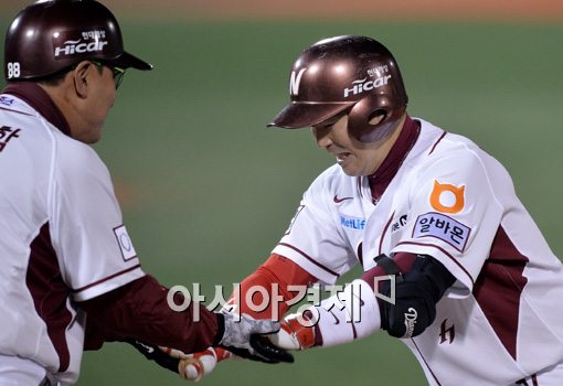 [아시아경제 김현민 기자] 프로야구 LG 트윈스와 넥센 히어로즈의 플레이오프 1차전이 27일 목동구장에서 열렸다. 2회말 1사 만루에서 넥센 박헌도가 선제 1타점 적시타를 치고 심재학 코치와 하이파이브하고 있다. 김현민 기자 kimhyun81@asiae.co.kr<ⓒ세계를 보는 창 경제를 보는 눈, 아시아경제(www.asiae.co.kr) 무단전재 배포금지>