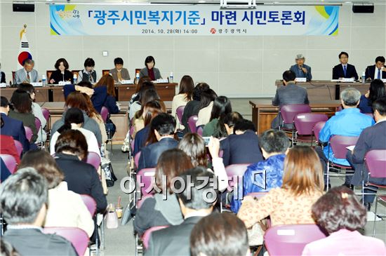 광주광역시는 28일 오후 시청 3층 중회의실에서 민선6기 공약인 광주시민복지기준을 마련하기 위한 토론회를 열고 복지기준을 어떻게 정할 것인지에 대해 논의했다.