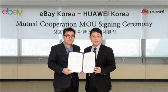 29일 이베이코리아가 중국 화웨이 한국지사(한국화웨이)와 양해각서(MOU)를 체결하고 화웨이의 대표 스마트폰 케이스와 대용량 배터리 등 스마트폰 액세서리 오픈마켓 단독판매 등을 공동 추진하기로 협의했다. 왼쪽부터 한국화웨이 켈빈 딩 지사장, 나영호 이베이코리아 국가간거래담당 상무가 MOU 체결 기념 촬영을 하고 있다. <br />