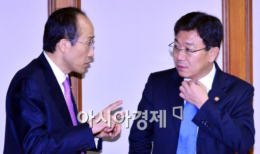 [아시아경제 최우창 기자]윤상직 산업통상자원부 장관(오른쪽)과 추경호 국무조정실장이 30일 서울 여의도 수출입은행에서 열린 경제관계장관회의 시작 전 대화하고 있다.최우창 기자 smicer@asiae.co.kr<ⓒ세계를 보는 창 경제를 보는 눈, 아시아경제(www.asiae.co.kr) 무단전재 배포금지>