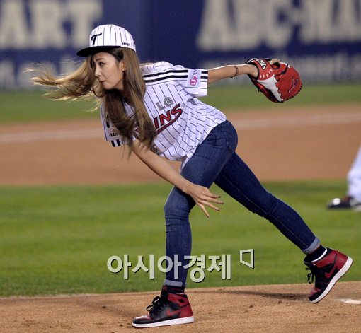 [아시아경제 김현민 기자] 프로야구 넥센 히어로즈와 LG 트윈스의 플레이오프 3차전이 30일 서울 잠실구장에서 열렸다. 걸그룹 에이핑크 윤보미가 시구를 하고 있다.