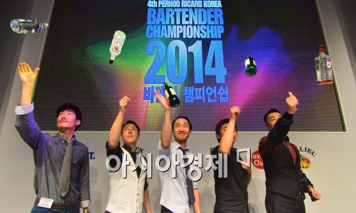 [아시아경제 최우창 기자]2일 서울 강남구 백암아트홀에서 대한민국 최고의 크리에이티브 및 플레어 바텐더를 뽑는 '제4회 페르노리카 코리아 바텐더 챔피언쉽 2014'의 결선이 열린 가운데 플레어 부문에 참가자들이 화려한 쇼를 선보이고 있다. 최우창 기자 smicer@asiae.co.kr<ⓒ세계를 보는 창 경제를 보는 눈, 아시아경제(www.asiae.co.kr) 무단전재 배포금지>