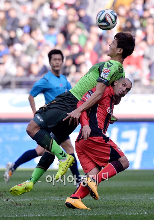 [아시아경제 김현민 기자] 프로축구 FC 서울과 전북 현대의 K리그 클래식 34라운드 경기가 2일 서울월드컵경기장에서 열렸다. 서울 에스쿠데로와 전북 김기희가 공중볼을 다투고 있다. 김현민 기자 kimhyun81@asiae.co.kr<ⓒ세계를 보는 창 경제를 보는 눈, 아시아경제(www.asiae.co.kr) 무단전재 배포금지>