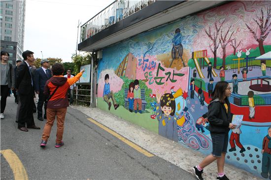 또 경기 불황으로 침체된 골목상권의 활성화를 위해 소규모 점포 쇼윈도에도 작품을 설치, 거리에 활력을 불어 넣는 등 다양한 시도가 돋보인다.주민들이 참여하는 도시 재생과 마을의 정체성을 알리려는 목적으로 추진된 강풀 만화거리에는 이미 50여점의 벽화가 조성돼 있어 많은 사람들이 방문하는 명소로 자리 잡았다. 실제로 지난달 22일에는 전북 익산시 제일고등학교 학생들이 서울로 수학여행을 와 자유일정으로 마련된 시간에 특별히 강동구 성안마을을 방문한 바 있다. 구는 방문객들의 작품 관람의 이해를 돕기 위해 성안마을 벽화 해설사 프로그램을 운영하고 있다. 벽화 해설사 프로그램은 한 달간 소정의 교육을 마친 벽화해설가들이 안내를 하는데 현재 매주 토요일 두시 정기투어와 사전 예약을 통한 상시투어로 운영되고 있다. 강동구 도시디자인과(☎3425-6133)박종일 기자 dream@asiae.co.kr<ⓒ세계를 보는 창 경제를 보는 눈, 아시아경제(www.asiae.co.kr) 무단전재 배포금지>