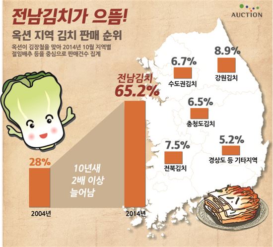 옥션이 김치 판매량을 조사한 결과 10년간 변함 없이 전남 김치가 인기를 얻은 것으로 나타났다.