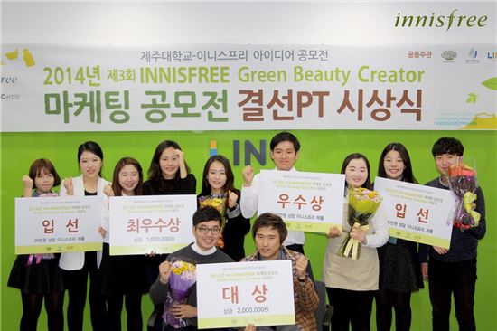 [아시아경제 임혜선 기자] 화장품 브랜드 이니스프리는 지난 3일 제주대학교 및 제주대학교 LINC사업단과 공동으로 개최한 '제주대 그린 뷰티 크리에이터 마케팅 공모전'의 최종 발표회와 시상식을 진행했다고 4일 밝혔다.이번 공모전은 제주 원료를 활용한 신제품 제안과 이니스프리 제주하우스 체험 콘텐츠 제안, 제주 곶자왈 CSR 홍보 전략 총 3가지 주제로 진행됐다.공모전에는 총 40개 팀으로 구성된 76명의 참가자가 응모했다. 아이디어에 대한 창의성, 실현가능성 및 논리성, 작품완성도 등 엄격한 심사 기준을 거쳐 최종 5팀이 선발됐다. 참신한 아이디어가 돋보인 이번 공모전에서는 '이니스프리의 13번째 원료 아티촉촉' 이라는 아이템을 제안해 창의성과 논리성 부분에서 높은 평가를 받은 제주대 이태훈 (관광경영학 4년)과 이영석(영어영문학 4년) 학생이 대상을 수상했다. 이번 공모전은 총 1000만원 상당의 장학금과 부상이 제공된다. 졸업예정자인 입상자들에게는 이니스프리의 인턴십 기회가 제공된다. 임혜선 기자 lhsro@asiae.co.kr<ⓒ세계를 보는 창 경제를 보는 눈, 아시아경제(www.asiae.co.kr) 무단전재 배포금지>