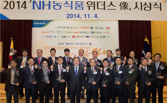 김주하 농협은행장(사진 앞줄 가운데) 4일 본사 3층 회의실에서 우수 농식품 기업 대표 20명에게 'NH농식품 위더스 상'을 시상하고 기념사진을 찍고 있다.(자료제공:농협은행)