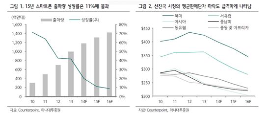 하나대투證, 스마트폰업계 내년 성장률 둔화속도 더욱 빨라져스마트폰 출하량, 전년대비 11% 성장에 그친 13억만대 추정중국업체 성장속도는 둔화될 것…중저가폰 경쟁 격화로 원가경쟁력 급부상[아시아경제 이초희 기자]내년 스마트폰 업계가 무한경쟁 체제로 진입한 가운데 성장률 둔화속도가 더욱 빨라질 것이라는 전망이 제기됐다. 또 내년 중저가 스마트폰이 춘추전국시대를 맞으면서 원가 경쟁력이 중요한 이슈로 부각될 것이라는 관측이다. 하나대투증권은 4일 휴대폰업종의 경쟁이 가속화되는 가운데 스마트폰 출하량이 전년대비 11% 성장에 그친 13억만대가 될 것으로 추정했다. 성장 둔화는 올해보다 한층 두드러지게 나타나며 평균판매 단가의 하락 속도가 가속화될 것으로 전망했다. 하나대투에 따르면 2010년에서 2013년까지 북미 및 서유럽 등의 선진국 시장에서 스마트폰의 하드웨어 스펙 상향이 활발하게 일어나며 스마트폰의 평균판매단가는 5% 내외 상향됐다. 이에 올해부터는 하드웨어 스펙의 상향이 제한적으로 진행되며 평균판매단가의 하락 반전이 일어났다고 분석했다. 200달러 이하의 가격대를 가진 중가 및 저가 스마트폰의 비중은 2010년 18%에서 2015년 55%로 3배 확대될 것으로 전망됐다. 미들엔드급(중저가) 중심의 성장이 일어나는 이유는 북미와 같은 선진국은 스마트폰 침투율이 88%에 달해 글로벌 평균 침투율인 70%를 상회하고 있기 때문에 수요가 제한적이기 때문이라는 분석이다.중국을 중심으로 아시아, 중동 및 아프리카 지역에서의 출하량 증가가 나타날 것이라는 전망이다. 중국의 스마트폰 침투율은 2011년 1분기 32%에서올 2분기 94%까지 확대돼 북미 지역을 앞질렀다. 동기간 중국의 스마트폰 시장이 글로벌 안에서 차지하는 비중은 21%에서 35%로 확대됐다..