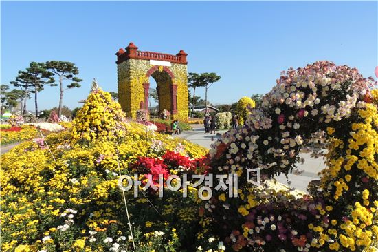 청명한 가을 하늘이 이어진 가운데 4일 전남 함평군 함평읍 함평엑스포공원 ‘2014 대한민국 국향대전’ 축제장에 국화꽃이 만개해 장관을 이루고 있다. <br /> <br /> <br /> ‘국화향기 그윽한 풍요로운 함평천지!’를 주제로 열리는 이번 국향대전은 오는 11월9일까지 관광객 동선 주요 길목에 대형 국화작품과 기획 작품을 배치한 야외 전시, 수준 높은 국화 분재 작품을 관람할 수 있다.<br /> <br />
