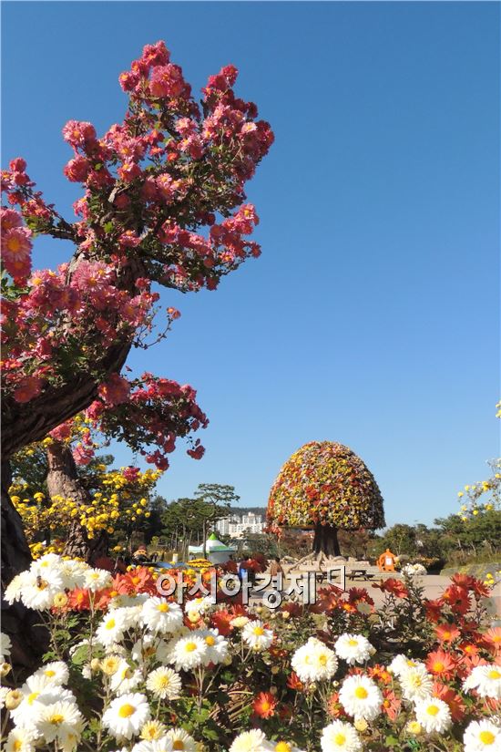 청명한 가을 하늘이 이어진 가운데 4일 전남 함평군 함평읍 함평엑스포공원 ‘2014 대한민국 국향대전’ 축제장에 국화꽃이 만개해 장관을 이루고 있다. 이날 전국에서 수많은 관광객들이 몰려 들어 그윽한 국화향기를 맡으면서 깊어가는 가을을 만끽했다. <br /> <br /> <br /> <br /> ‘국화향기 그윽한 풍요로운 함평천지!’를 주제로 열리는 이번 국향대전은 오는 11월9일까지 관광객 동선 주요 길목에 대형 국화작품과 기획 작품을 배치한 야외 전시, 수준 높은 국화 분재 작품을 관람할 수 있다.