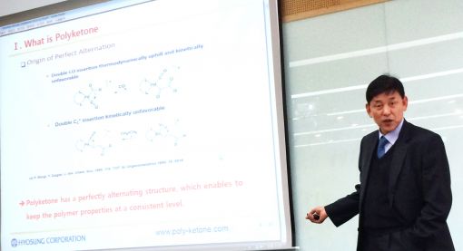 이원 효성기술원 전무가 4일 연세대 GS칼텍스 산학협력관 1층 석산홀에서 폴리케톤 기술 및 전망에 대해 강의하고 있다.