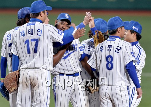 [대구=아시아경제 김현민 기자] 프로야구 삼성이 한국시리즈 승부를 원점으로 되돌렸다. 삼성은 5일 대구구장에서 열린 2014 프로야구 넥센과의 한국시리즈 2차전에서 선발 윤성환의 7이닝 1실점 호투와 외국인타자 야마이코 나바로(27)의 맹타를 앞세워 7-1로 이겼다. 이날 승리로 전날 2-4 패배를 설욕하며 시리즈 전적 1승 1패를 기록, 균형추를 맞췄다.삼성 선수들이 승리를 만끽하고 있다. 김현민 기자 kimhyun81@asiae.co.kr<ⓒ세계를 보는 창 경제를 보는 눈, 아시아경제(www.asiae.co.kr) 무단전재 배포금지>