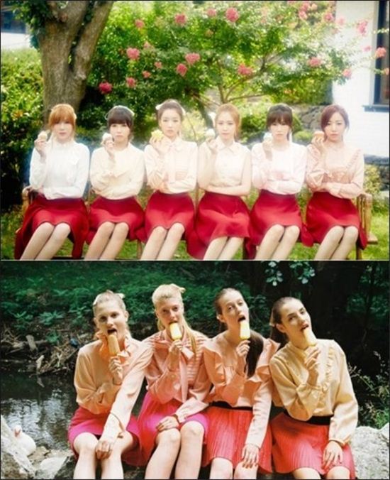 에이핑크, 컴백 앞서 이미지 표절?…'푸델카 작품' 사진 비교해보니…[아시아경제 온라인이슈팀] 걸그룹 에이핑크가 컴백을 앞두고 표절 논란에 휩싸여 논란을 일으키고 있다. 5일 걸그룹 에이핑크는 발표를 앞두고 있는 5번째 미니앨범 콘셉트 이미지를 공개했다. 공개된 컴백 콘셉트 이미지의 에이핑크 멤버들은 레이스가 달린 상의와 빨간 스커트를 매치해 청순한 매력을 발산하고 있다. 이들은 일렬로 나란히 앉아 쿠키, 마카롱, 컵케이크 등을 들고 무표정으로 정면을 바라보고 있다. 하지만 일각에서 해당 이미지가 표절된 것이라는 주장이 제기됐다. 한 네티즌은 "에이핑크의 이미지는 패션 사진작가 마이클 푸델카(Michal Pudelka)의 작품을 모방했다"면서 두개의 사진을 비교한 것을 온라인 커뮤니티에 게시하기도 했다. 푸델카의 작품을 보면 네 명의 여성이 나란히 앉아 무표정한 얼굴로 아이스크림을 입에 물고 있다. 이들은 에이핑크처럼 상의는 블라우스를, 하의는 빨간색 치마를 입고 있고 포즈 또한 비슷하다. 이에 에이핑크 소속사 에이큐브 엔터테인먼트는 "표절 의혹에 굉장히 당황스럽다" 고 밝혔다.이어 "그런 사진이 있는 줄 몰랐다. 갑자기 이런 논란이 불거져서 그제야 사진을 보게 됐다"며 "해당 사진을 가지고 작업을 한 것이 전혀 아니다. 에이핑크가 원하는 콘셉트를 추구하다 보니 비슷한 상황이 연출된 것 같다. 내부적으로 회의를 통해 이야기를 해봐야 알 것 같다"고 밝혔다.한편 에이핑크는 오는 17일 신곡을 발표하고 본격 컴백 활동에 돌입할 예정이다. 에이핑크 표절 의혹 소식을 접한 네티즌들은 "에이핑크 표절 의혹, 진짜 비슷하다" "에이핑크 표절 의혹, 사실이면 실망이다" "에이핑크 표절 의혹, 진실은 뭘까" 등의 반응을 보였다. 온라인이슈팀 issue@asiae.co.kr<ⓒ세계를 보는 창 경제를 보는 눈, 아시아경제(www.asiae.co.kr) 무단전재 배포금지>