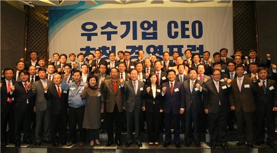 김주하 농협은행장(앞줄 가운데)이 6일 경남 창원시 리베라컨벤션에서 경남 지역 기업체 CEO 등 30여 명을 초청하여 경영포럼을 열고 기념사진을 찍고 있다.(자료제공:농협은행)