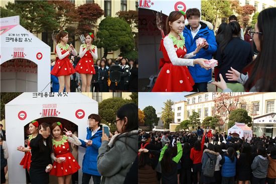 [아시아경제 장용준 기자]걸그룹 크레용팝의 유닛 딸기우유(초아, 웨이)가 수학능력시험을 앞둔 여고생들에게 특별한 추억을 선사했다.딸기우유는 5일 서울 종로구에 위치한 풍문여자고등학교를 방문해 깜짝 공연을 펼쳐 수험생들을 위로하고 딸기우유를 나눠주는 이벤트를 실시했다.그 동안 신촌, 잠실 등 번화가에서 게릴라 이벤트를 실시하며 시민들과 소통의 시간을 가졌던 딸기우유가 이번엔 수험생들과 함께하는 시간을 가진 것.점심시간 도중 깜짝 등장한 딸기우유를 본 여고생들은 열화와 같은 환호성을 지르며, 딸기우유의 방문을 환영했다.학생들은 또 딸기우유의 데뷔곡 'OK'를 떼창하며 그 동안 수험 스트레스를 말끔히 날려버렸다. 응원법을 외치며 'OK'를 부르는 여고생들의 모습에 딸기우유 역시 놀라움을 감추지 못했다.딸기우유는 공연을 마친 후 "수능이 얼마 남지 않았는데 수험생 분들 모두 힘내시고 꼭 좋은 결과 있기를 바란다"고 응원 메시지를 전하며 현장에 있던 모든 학생들에게 일일이 딸기우유를 나눠줬다.한편 'OK'로 왕성하게 활동 중인 딸기우유는 6일 케이블채널 Mnet 엠카운트다운에 출연할 예정이다.장용준 기자 zelra@asiae.co.kr<ⓒ세계를 보는 창 경제를 보는 눈, 아시아경제(www.asiae.co.kr) 무단전재 배포금지>