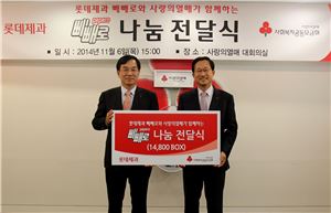 김용수 롯데제과 대표이사(왼쪽)가 김주현 사랑의열매 사무총장에게 빼빼로를 전달한 후 기념촬영을 하고 있다.<br />