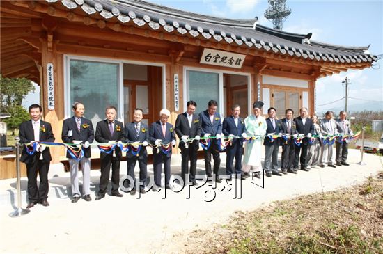 곡성군은 애국지사 백당(白堂) 신태윤 선생 기념관을 개관하고 유근기 곡성군수 등 참석자들이 테이프를 자르고 있다.