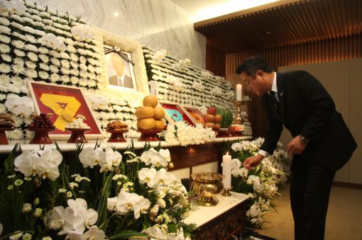 9일 서울 서대문구 신촌 세브란스병원 장례식장에 차려진 이동찬 코오롱그룹 명예회장의 빈소에서 이웅열 코오롱 회장이 분향하고 있다.