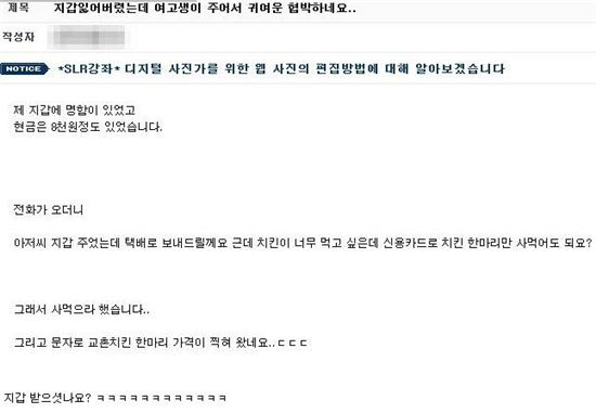 지갑 주운 여고생 '귀여운' 협박?…"치킨 한 마리만 사먹을게요"[아시아경제 온라인이슈팀] 지갑을 주운 한 여고생의 '귀여운 협박'이 인터넷서 눈길을 끌고 있다. 8일 한 온라인 커뮤니티에 '지갑 잃어버렸는데 여고생이 주어서 귀여운 협박하네요'라는 제목의 글이 게재됐다. 글쓴이는 "전화가 오더니 '아저씨 지갑 주웠는데 택배로 보내드릴게요. 그런데 치킨이 너무 먹고 싶은데 신용카드로 치킨 한 마리만 사먹어도 돼요?'라고 해서 사먹으라 했다"고 말했다. 지갑을 주운 여고생이 잃어버린 글쓴이의 지갑에 명함이 있어 이를 보고 전화한 것. 이어 글쓴이는 "그리고 문자로 교촌치킨 한 마리 가격이 찍혀 왔다"며 여고생을 향해 "지갑 받으셨나요?"라며 글을 마무리했다. 이에 대해 네티즌들은 "귀엽다" "절도죄 아닌가?" "재밌는 해프닝이다" 등의 반응을 보였다. 온라인이슈팀 issue@asiae.co.kr<ⓒ세계를 보는 창 경제를 보는 눈, 아시아경제(www.asiae.co.kr) 무단전재 배포금지>