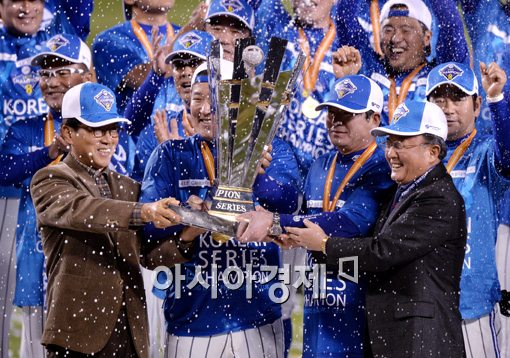 [포토]4년 연속 우승 트로피 들어올린 삼성