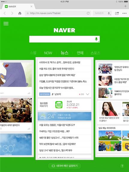 -이용자가 원하는 주제로 메인 구성·편집할 수 있는 '커버 기능' 제공-상단 툴바 영역 메뉴 간소화 등 간편한 UI로 개편 [아시아경제 박나영 기자] 네이버(대표이사 김상헌)는 네이버 애플리케이션 아이패드 버전의 이용자가 더욱 빠르고 편리하게 메인 페이지의 콘텐츠를 소비할 수 있도록 ‘커버’ 기능을 도입해 사용 편의성을 강화했다고 12일 밝혔다. 네이버는 커버 화면에 뉴스, 동영상, 라이프 등 개별 주제의 메인 페이지를 카드 형태로 제공하고 이용자가 보고 싶은 주제를 직접 선택하고 순서도 편집할 수 있게 했다. 또 두 개의 손가락을 활용한 '핀치 투 줌' 동작으로 네이버 앱과 커버 간의 이동을 빠르게 할 수 있도록 했다. 커버 편집 및 제스처 기능에 대한 사용법은 네이버앱 업데이트 후 제공되는 ‘튜토리얼(도움말)’을 통해 자세히 확인할 수 있다. 이 외에도 더 크고 시원한 화면으로 앱을 이용할 수 있도록 상단 툴바 영역의 메뉴 구성을 간소화했다. 이종현 네이버 메인&투데이 셀장은 "메인 페이지의 콘텐츠를 빠르게 확인하고 싶은 이용자의 욕구를 최대한 반영해 개편을 진행했다”며 “향후 아이폰, 안드로이드폰 등 개선 범위를 확대해 가며 더 많은 이용자들의 편의를 높여 나가겠다”고 말했다박나영 기자 bohena@asiae.co.kr<ⓒ세계를 보는 창 경제를 보는 눈, 아시아경제(www.asiae.co.kr) 무단전재 배포금지>