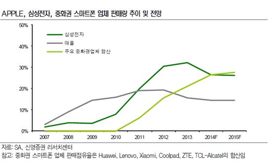 저가 스마트폰 시장 확대…신흥시장 확보가 최대 관건중화권 업체의 약진은 국내 제조사에게는 리스크[아시아경제 이초희 기자]내년에도 중국 휴대폰 업체들의 저가 시장 침투가 예상되는 가운데 혁신보다는 시장환경 변화에 대응이 중요하다는 진단이 제기됐다. 특히 신흥시장 확보가 최대 관건으로 꼽혔다.시장조사기관 스트래티지애널리틱스(SA)에 따르면 올해 연간 글로벌 스마트폰 출하량은 12억5680만대로 추정되며, 이 가운데 주요 중화권 업체들의 합산 점유율은 26.6%로 예상된다. 반면 삼성전자와 애플의 점유율은 26.4%와 14.5%를 기록해 전년대비 5.9%p와 0.9%p 감소할 전망이다. 2015년에도 중화권 업체들의 약진이 이어져 글로벌 스마트폰 시장 내 점유율은 27.5%까지 상승할 것이라는 전망이다. 2012년 중화권 업체들의 시장 점유율이 15.6%였던 점을 감안하면 매우 빠른 성장속도다. 신영증권은 지난해 11월11일 발간한 산업 리포트를 통해 향후 글로벌 스마트폰 시장에서 중국과 인도의 판매량 증가가 가장 빠르고 글로벌 최대 시장이 될 것이라 전망했다. 2013년까지만 해도 중국과 인도 시장 내 점유율 1위는 확고히 삼성이 차지하고 있었으며 이에 따라 중장기적으로 애플 대비 삼성전자에 우호적인 시장환경 전개가 예상됐다.하지만 중국 후발 로컬업체들의 초저가 전략 전개에 따라 올 2분기 중국 스마트폰 시장 내 점유율 1위는 샤오미가 차지했으며, 삼성전자를 제외 시 순위권 내 대부분을 중국 로컬 기업이 차지했다..