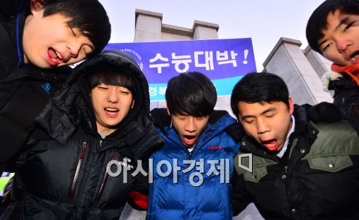 [아시아경제 최우창 기자] 2015학년도 대학수학능력시험이 실시된 13일 서울 용산고교에 마련된 고사장에서 재학생들이 응원을 하고 있다.최우창 기자 smicer@asiae.co.kr<ⓒ세계를 보는 창 경제를 보는 눈, 아시아경제(www.asiae.co.kr) 무단전재 배포금지>