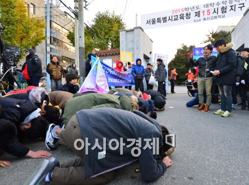 [아시아경제 최우창 기자] 2015학년도 대학수학능력시험이 실시된 13일 서울 용산고교에 마련된 고사장에서 재학생들이 큰절을 올리고 있다.최우창 기자 smicer@asiae.co.kr<ⓒ세계를 보는 창 경제를 보는 눈, 아시아경제(www.asiae.co.kr) 무단전재 배포금지>